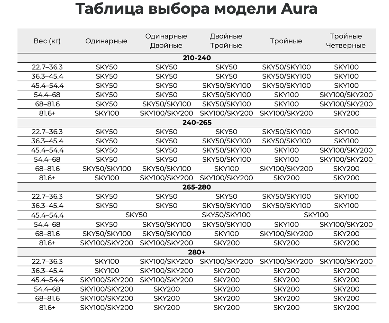 Таблица размеров: AURA