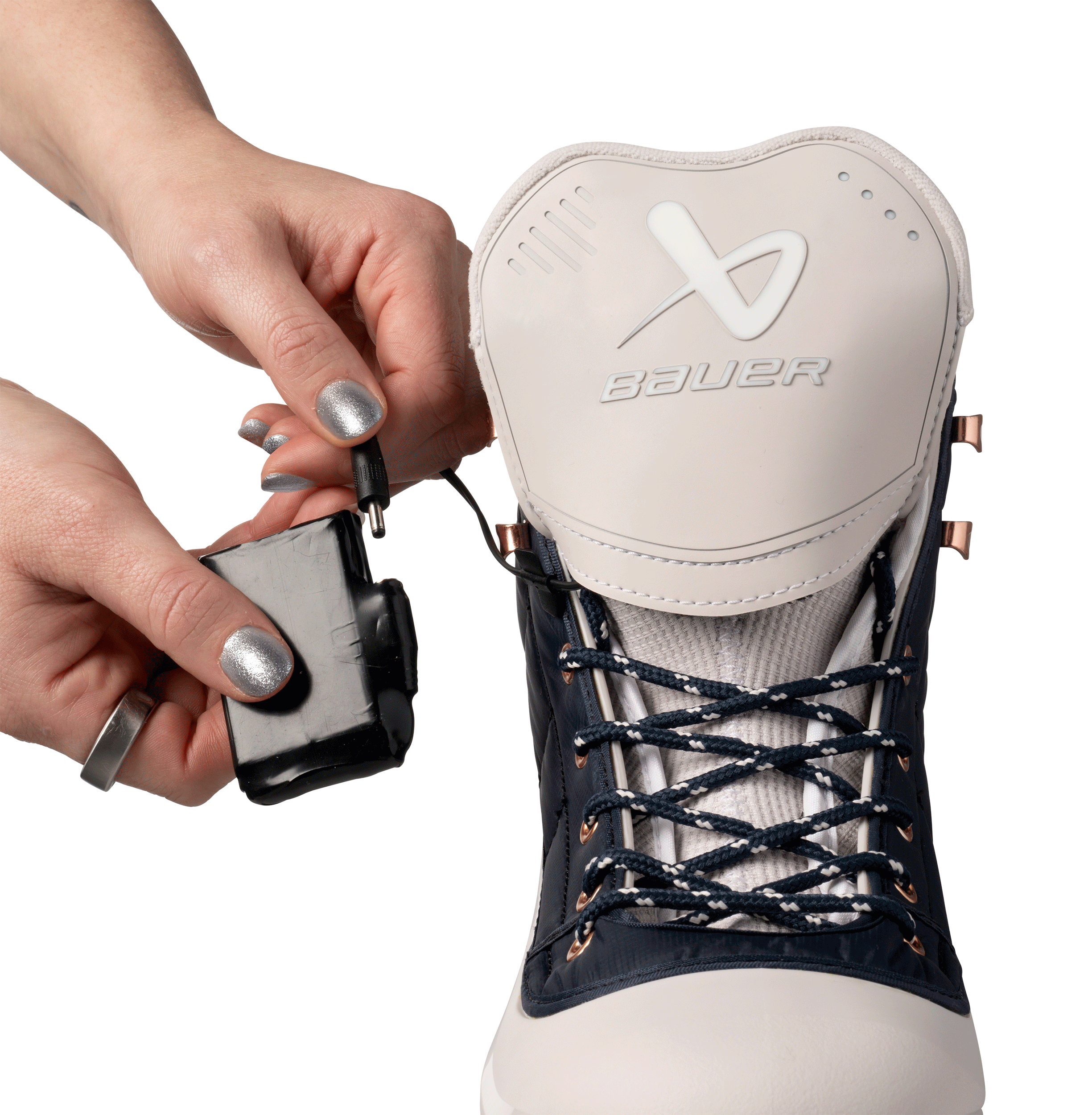 Представляем BAUER RADIANT Heated Skates — первые в мире подогреваемые хоккейные коньки. Эти коньки оснащены системой подогрева с тремя уровнями температуры, управляемыми одним нажатием кнопки. Благодаря мягкому, утеплённому воротнику и дизайну, вдохновлённому пуховиком, они идеально сохраняют тепло даже во время катания на морозе.