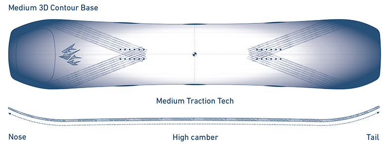 - Прогиб Camber обеспечивает равномерную гибкость по всей длине доски, сочетая отличную управляемость и стабильность с энергичным щелчком.