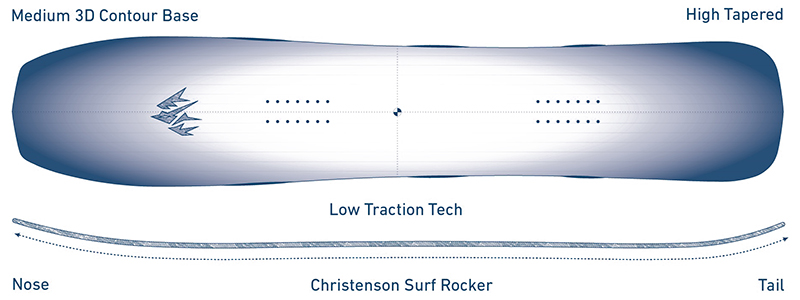 - Low 3D Contours Base — скругление кантов начинается с уровня появления рокера. Канты приподняты на 2 мм в зоне носа и хвоста, что способствует более легкой управляемости на разном типе снега.