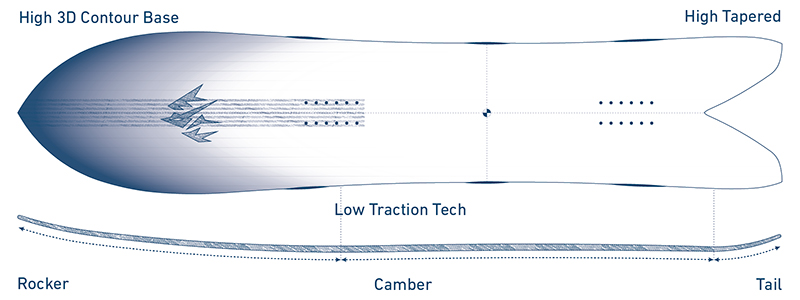 - High 3D Contours Base — скругление кантов начинается с уровня появления рокера. Канты приподняты на 7 мм в зоне носа и хвоста, что способствует более легкой управляемости и инициации поворота в глубоком снегу.
