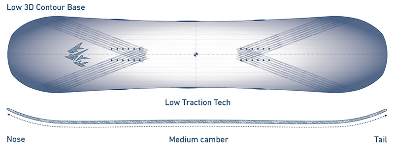 - Low 3D Contours Base — скругление кантов начинается с уровня появления рокера. Канты приподняты на 2 мм в зоне носа и хвоста, что способствует более легкой управляемости на разном типе снега.