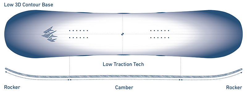 - Low 3D Contours Base — скругление кантов начинается с уровня появления рокера. Канты приподняты на 2 мм в зоне носа и хвоста, что способствует более легкой управляемости на разном типе снега.